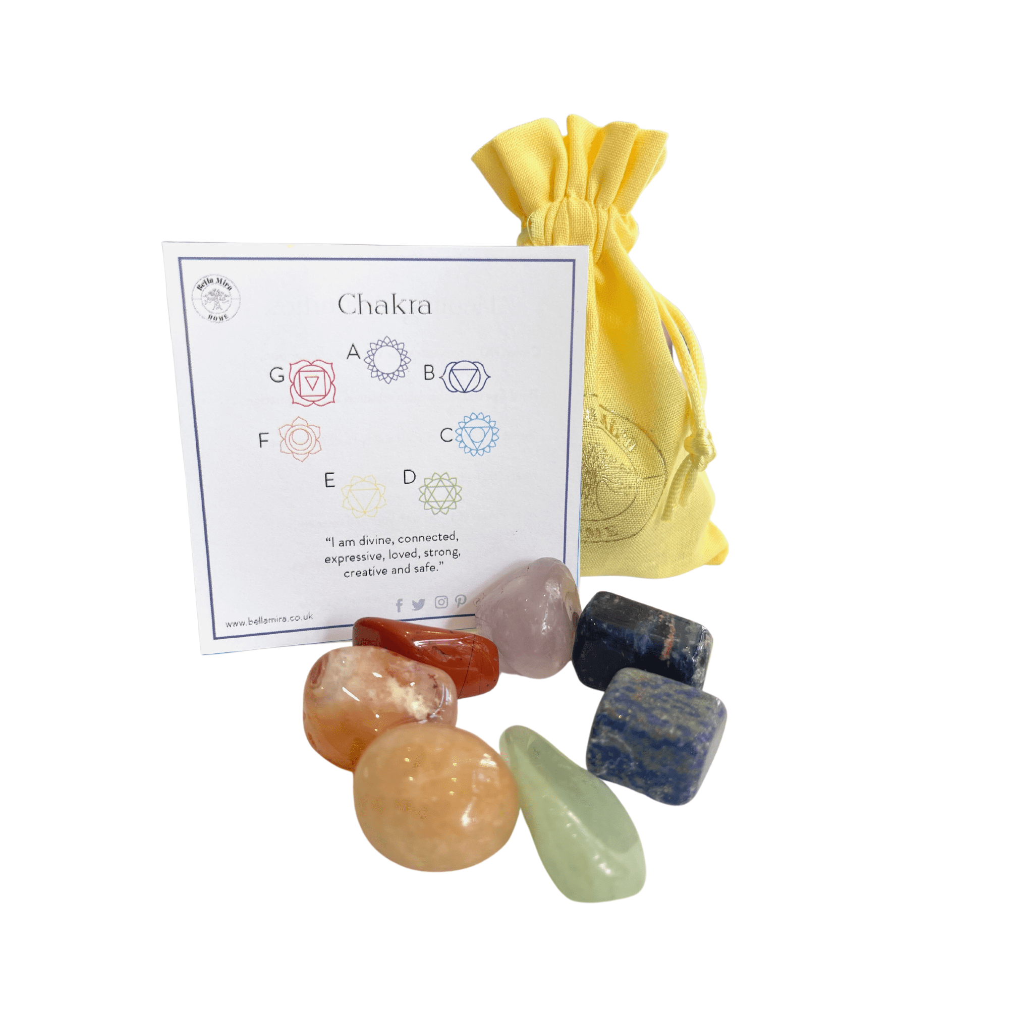 The Chakra polished crystals are for each of the 7 Chakras Amethyst (Crown), Sodalite (Third eye), Lapis Lazuli (Throat), Green Aventurine (Heart), Yellow Aventurine (Solar Plexus), Carnelian (Sacral), and Red Jasper (Root).