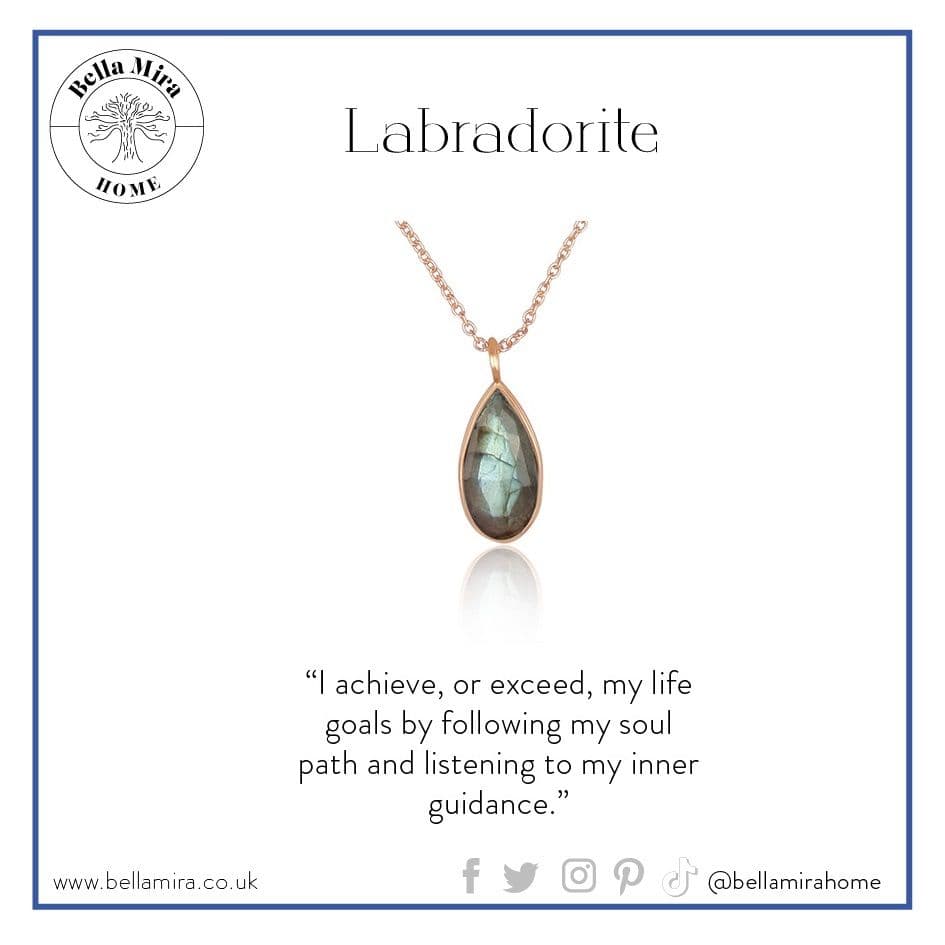 The necklace will be packaged with care in a gift box with an info card on the wellness properties of Labradorite.